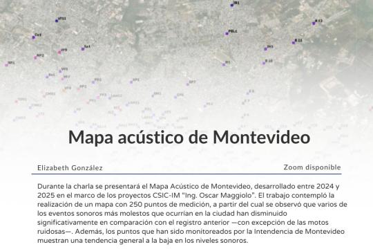 Este 16 de octubre de 2025 tendrá lugar un nuevo Seminario del Instituto de Mecánica de los Fluidos e Ingeniería Ambiental (IMFIA) titulado "Mapa acústico de Montevideo"; dictado por Elizabeth González. El Seminario es de entrada libre y gratuita.
