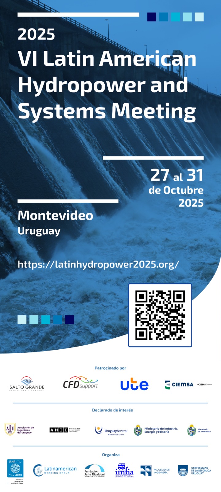 Del 27 al 31 de octubre de 2025 tendrá lugar el VI Latin American Hydropower and Systems Meeting en una nueva edición que se llevará a cabo en Montevideo, Uruguay. Este evento reúne a investigadores/as, profesionales, estudiantes y empresas del sector hidroenergético para compartir los últimos avances en el desarrollo, operación y sostenibilidad de los sistemas hidroeléctricos.