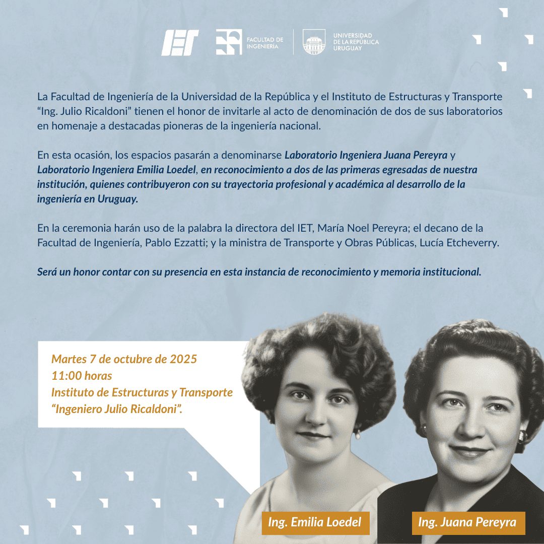 El acto de denominación se realizará el martes 7 de octubre de 2025, a las 11:00 horas, en el Instituto de Estructuras y Transporte “Ingeniero Julio Ricaldoni”. Contará con la participación de la directora del IET, María Noel Pereyra; el decano de la Facultad de Ingeniería, Pablo Ezzatti; y la ministra de Transporte y Obras Públicas, Lucía Etcheverry.