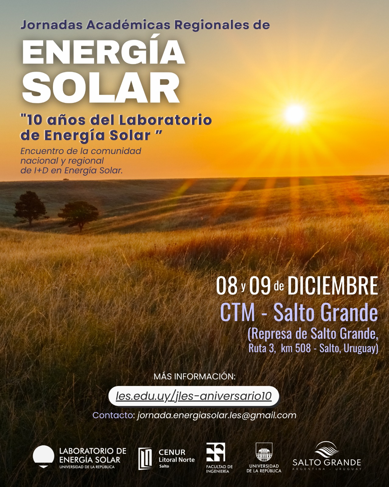 El Laboratorio de Energía Solar cumple 10 años e invita a toda la comunidad nacional y regional de I+D en Energía Solar a las III Jornadas Académicas Regionales en Energía Solar a realizarse en la ciudad de Salto, Uruguay, los días 8 y 9 de diciembre de 2025.
