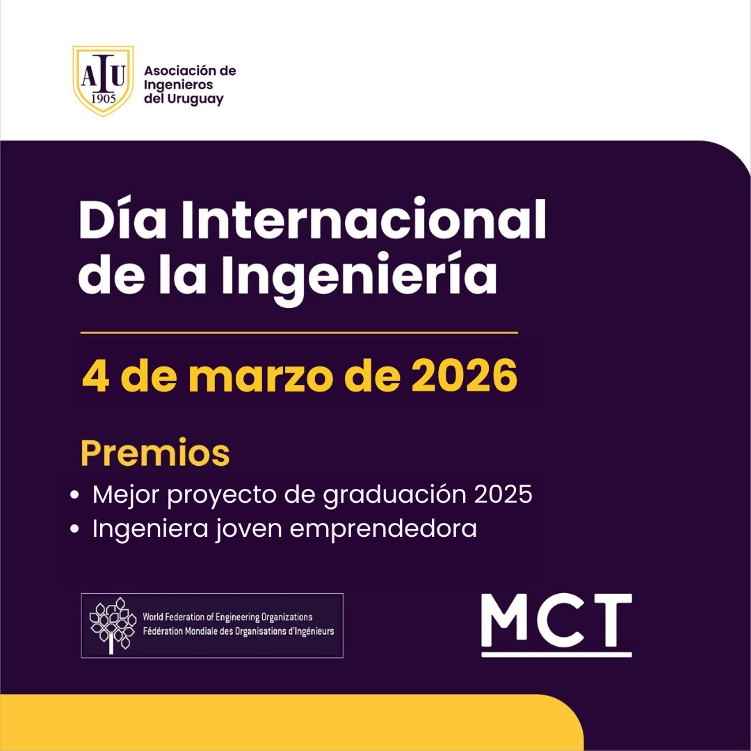 La Asociación de Ingenieros del Uruguay (AIU) anuncia la apertura de una convocatoria al Premio Proyecto Final de Carrera y el Premio Ingeniera Emprendedora Joven, en el marco del Día Mundial de Ingeniería, que se celebra el 4 de marzo.