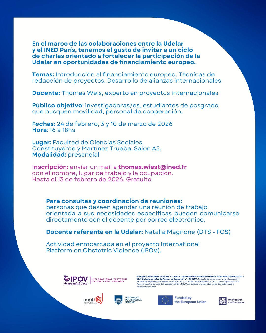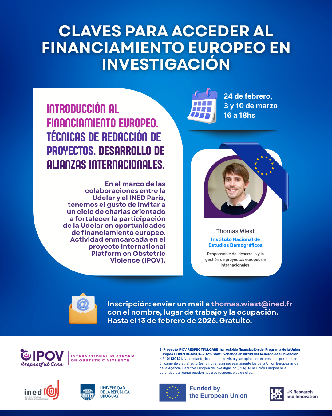 Las actividades estarán a cargo de Thomas Wiest, especialista en desarrollo y gestión de proyectos europeos e internacionales del INED. El ciclo forma parte del proyecto International Platform on Obstetric Violence (IPOV), financiado por la Unión Europea.