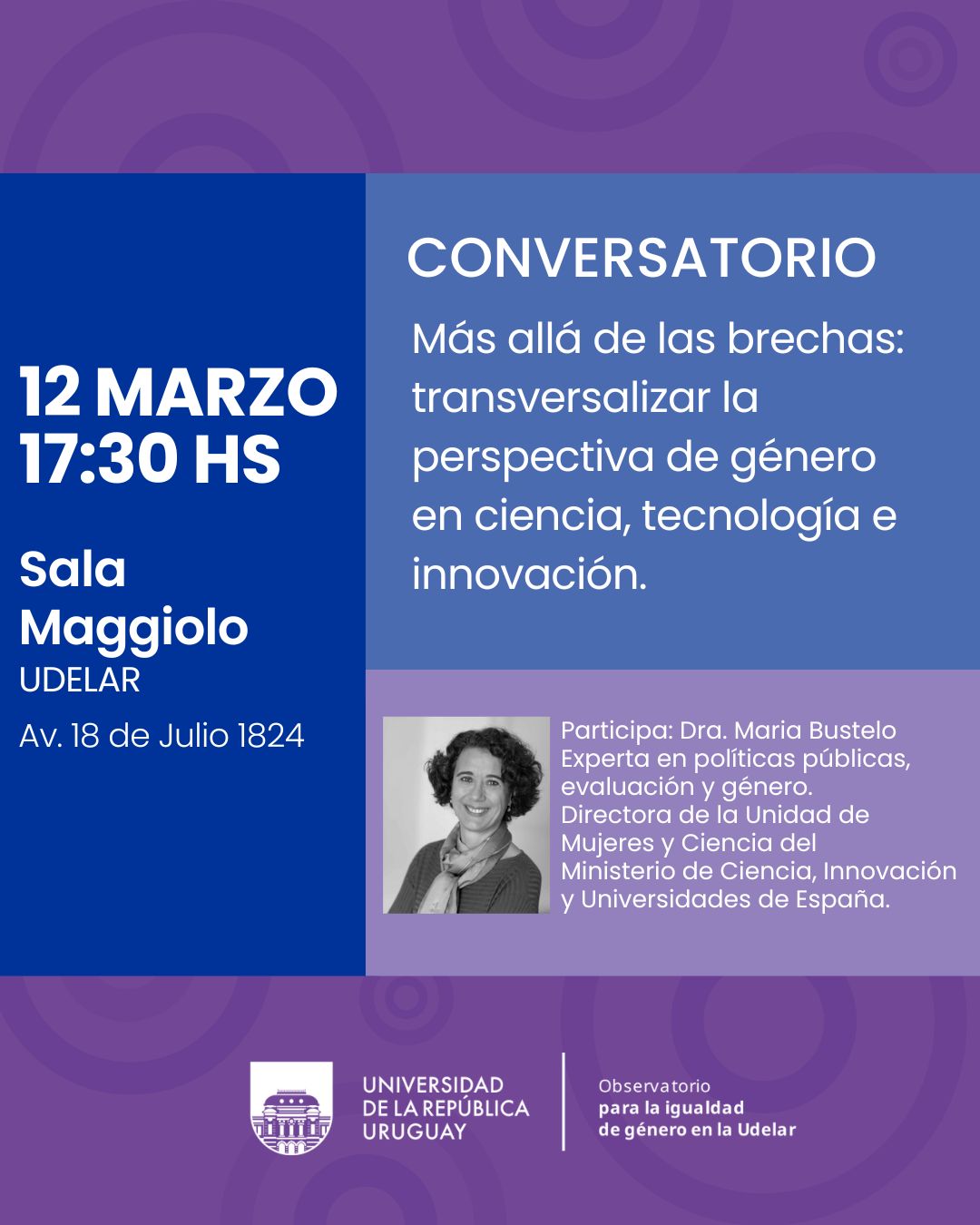 • Dra. María Bustelo (España). Directora de la Unidad de Mujeres y Ciencia, Secretaría de Estado de Ciencia, Innovación y Universidades, Ministerio de Ciencia, Innovación y Universidades.
