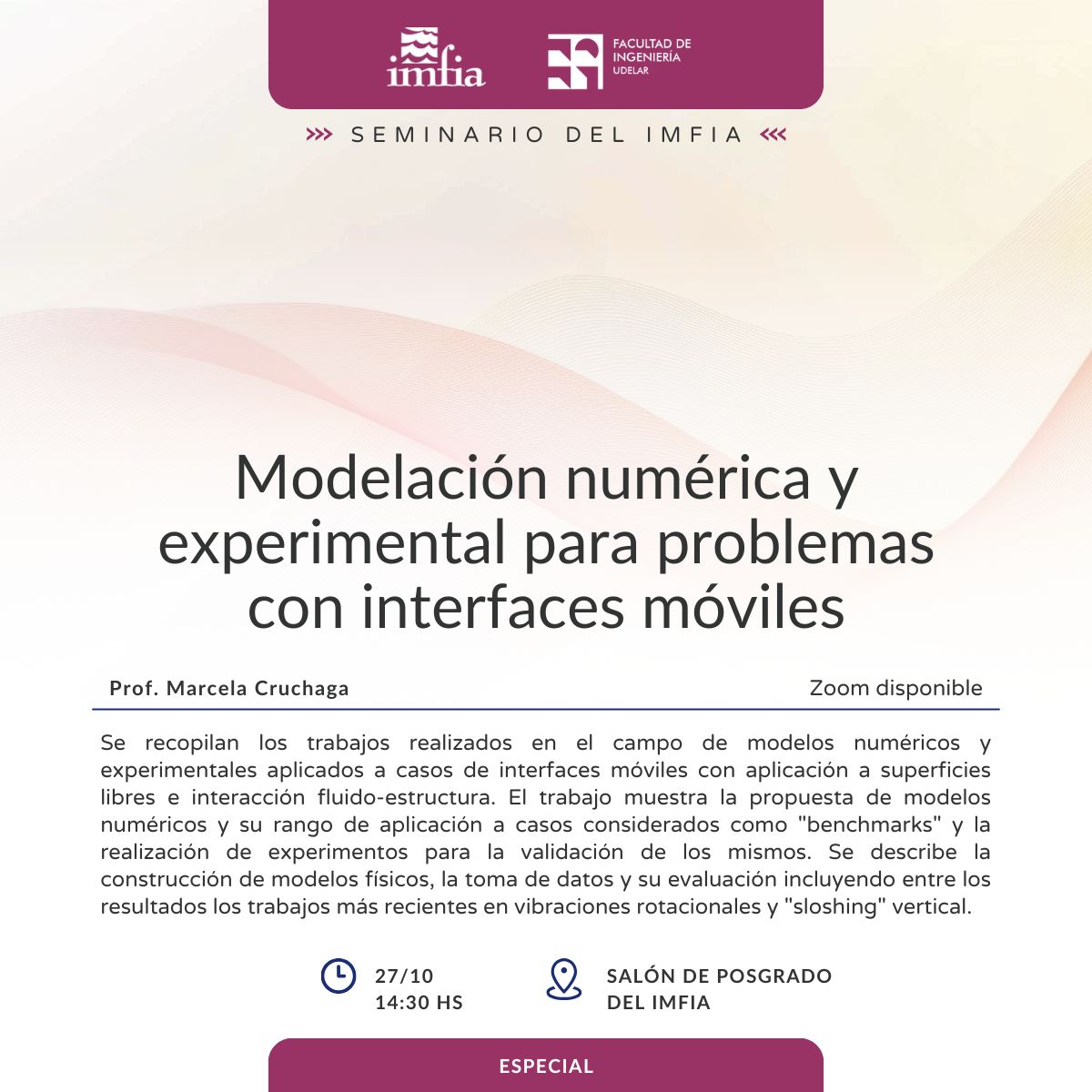 Este 27 de octubre de 2025 tendrá lugar un nuevo Seminario del Instituto de Mecánica de los Fluidos e Ingeniería Ambiental (IMFIA) titulado "Modelación numérica y experimental para problemas con interfaces móviles"; dictado por la Prof. Marcela Cruchaga, de la Universidad de Santiago de Chile.